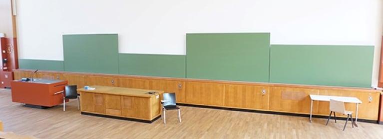 With its 481 seats, the Heinz-Schönfeld lecture hall is one of the largest lecture theatres at TU Dresden. It is one of the outstanding Dresden buildings of the early 1960s and is a listed building. In addition to the aesthetics typical of the time, the lecture hall is characterised by good room acoustics, which even in its day attracted national attention in the professional world. However, the lecture hall was showing its age and therefore needed a complete upgrade – as did the technical equipment, which was no longer up to date and had become obsolete due to wear and tear. The blackboard system was also included in the extensive renovation work. The entire drive technology, including the ropes and pulleys, was badly worn. The aim was to replace the old blackboard system with a better technical solution.
