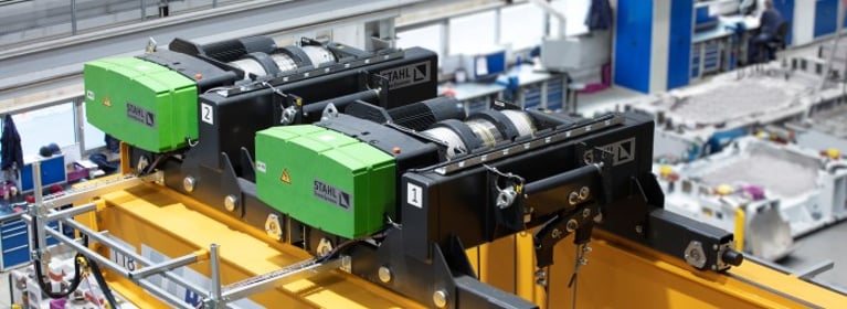 Nas fases individuais de construção, foram instalados dois guindastes de parede de um lado do corredor cada: um guindaste com um guindaste de cabo elétrico SH 5025-20 com S.W.L. reduzido de 8 t (dianteiro) e um guindaste com dois guindastes elétricos de cabo de aço SH 6040-10 da STAHL CraneSystems (traseira). Os guinchos de cabo de aço padrão foram adaptados individualmente a pedido do cliente e equipados, entre outras coisas, com tecnologia de segurança adicional, como o multicontrolador STAHL SMC 22.